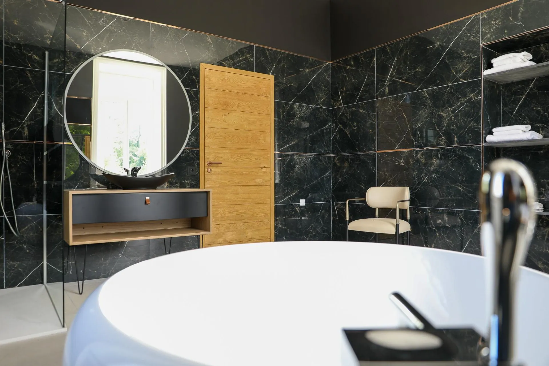 Une suite spacieuse et élégante, installée dans la Maison de Maître rénovée. Ambiance raffinée, confort moderne et décoration mêlant charme ancien et touches contemporaines.