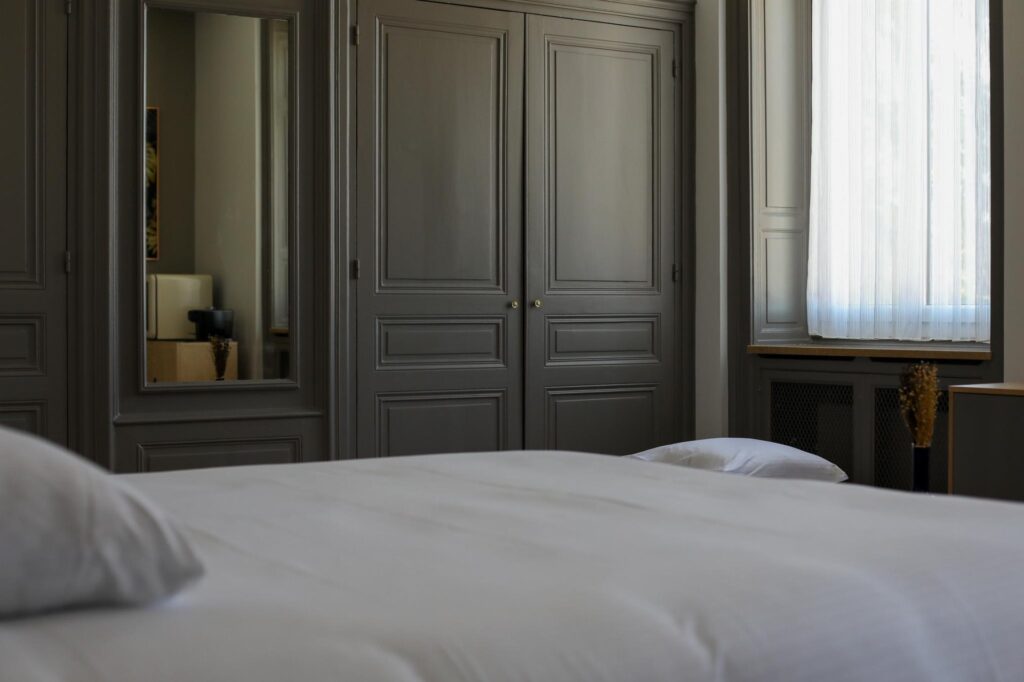 Située dans la Maison de Maître, elle associe des éléments d’origine à une rénovation raffinée : tons naturels, mobilier élégant, salle de bain moderne et atmosphère apaisante.